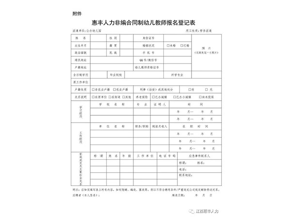 為滿足我市公辦幼兒園師資需求,我公司面向社會公開招聘一大批非事業(yè)編合同制幼兒教師,以勞務派遣的方式與用人單位進行勞動力資源開發(fā)合作。現將有關事項公告如下:一、招聘人數及崗位我市招聘非事業(yè)編合同制幼兒教師50名,具體崗位在選崗前公示。二、招聘方式通過第三方勞務公...